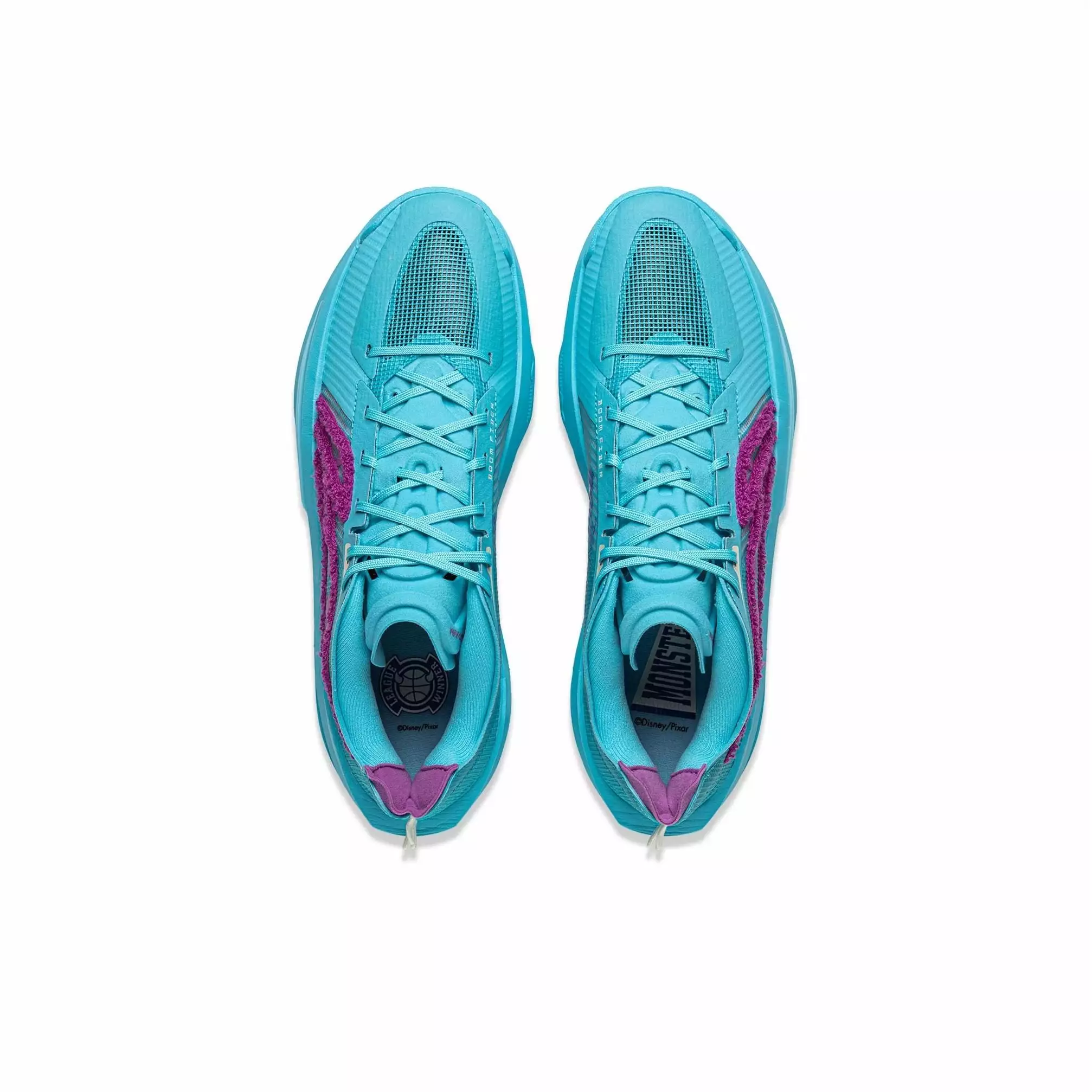 Li-Ning Ultralight 2025 x Disney Monster University — Special collaboration with Disney Pixar. Blue-purple design with fang and spike details. BENG + Light Foam technology for ultra-lightweight performance.